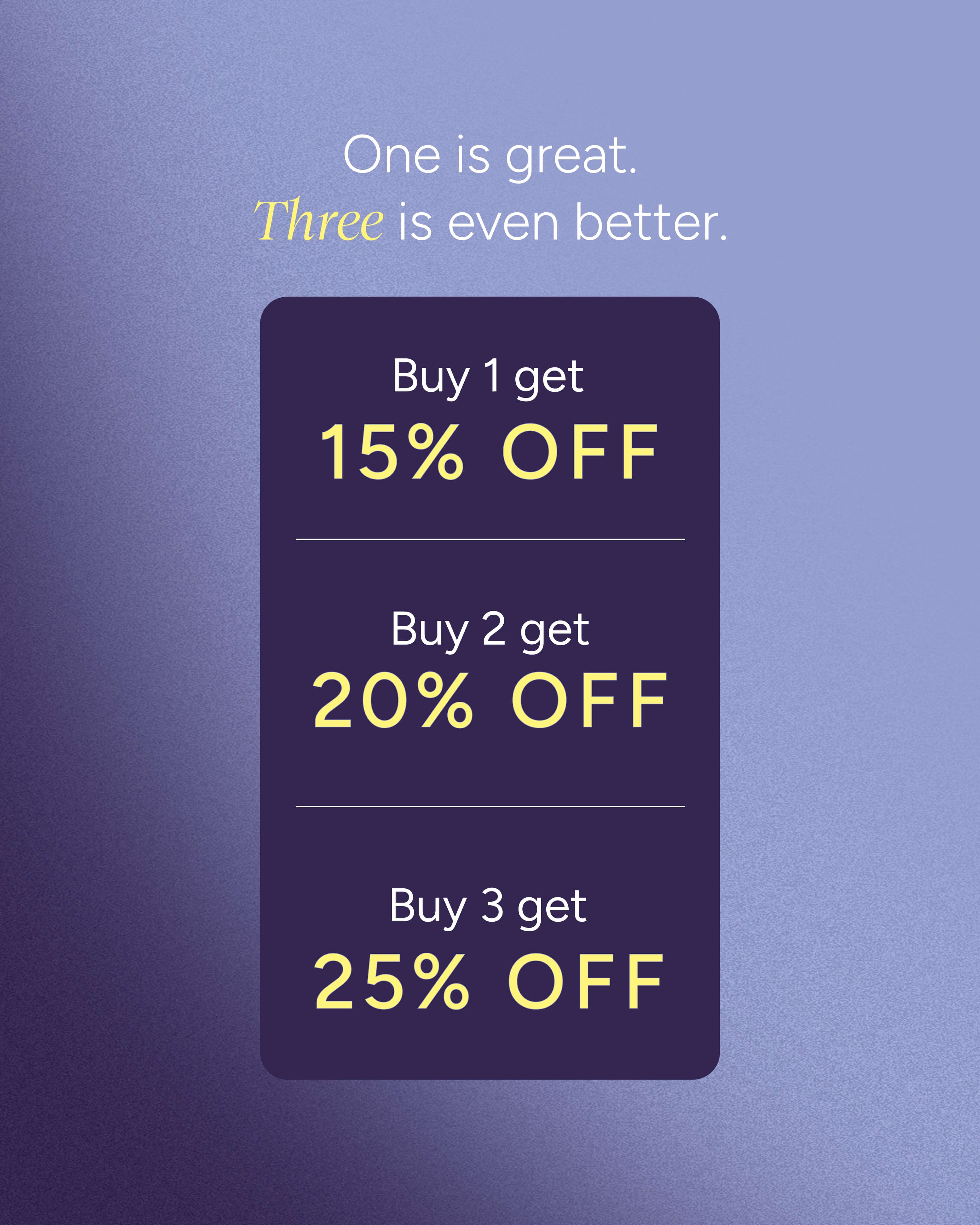 Buy 1 get 15% OFF Buy 2 get 20% OFF Buy 3 or more get 25% OFF