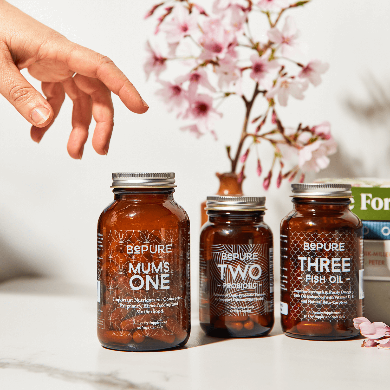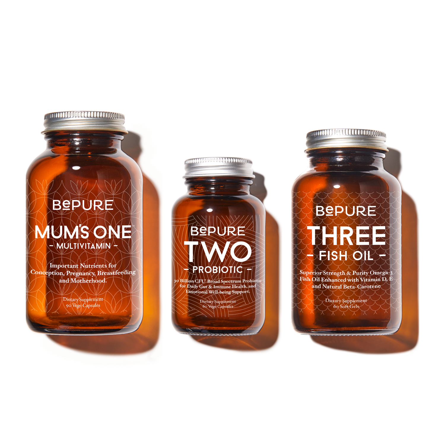 - BePure Three: A high-strength, pure omega-3 fish oil that supports your baby’s brain and eye development and helps maintain your own heart and joint health during pregnancy.